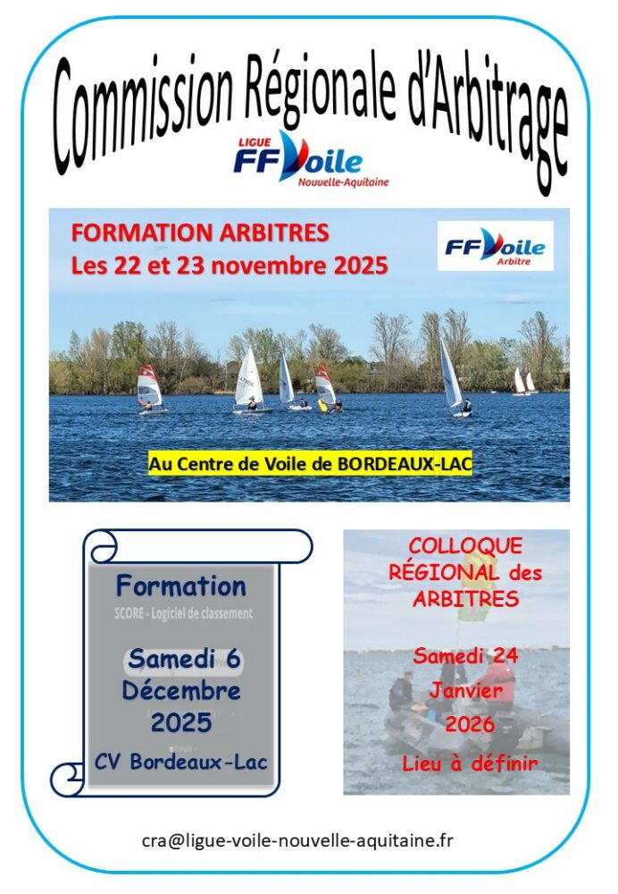 Formations et Colloque – Commission Régionale d’Arbitrage La Commission Régionale d'Arbitrage de la Ligue de Voile Nouvelle-Aquitaine communique les dates des prochaines sessions de formation : > Formation ARBITRE 22 & 23 novembre 2025 - Centre de Voile de...