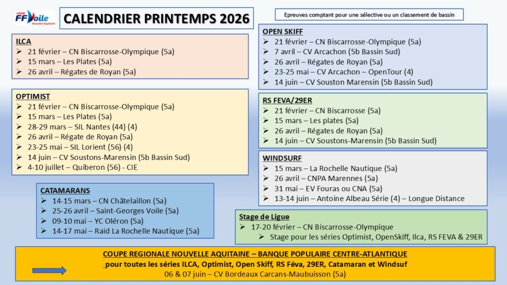 Calendriers des Régates du Championnat régional Nouvelle-Aquitaine Banque Populaire 2025-2026
